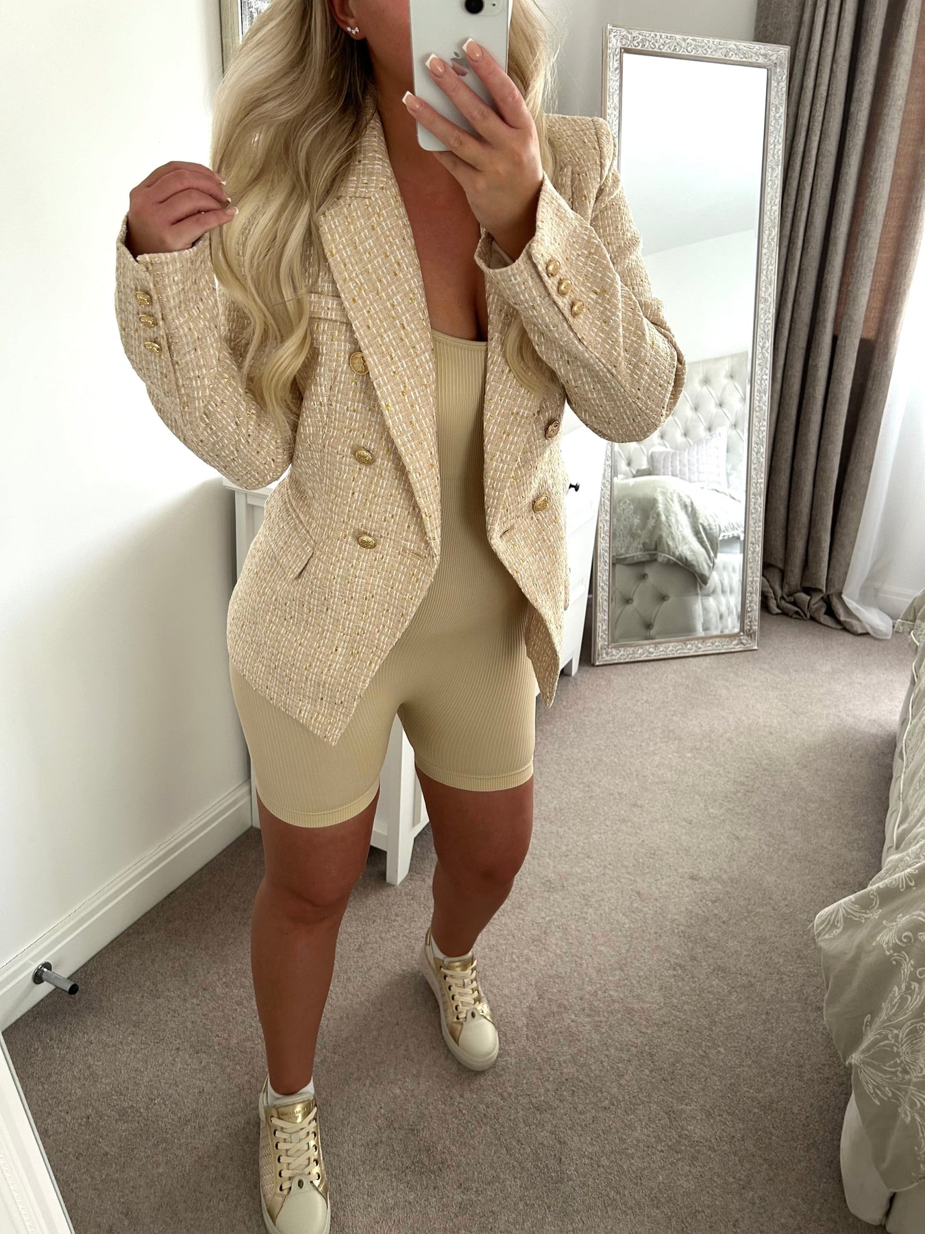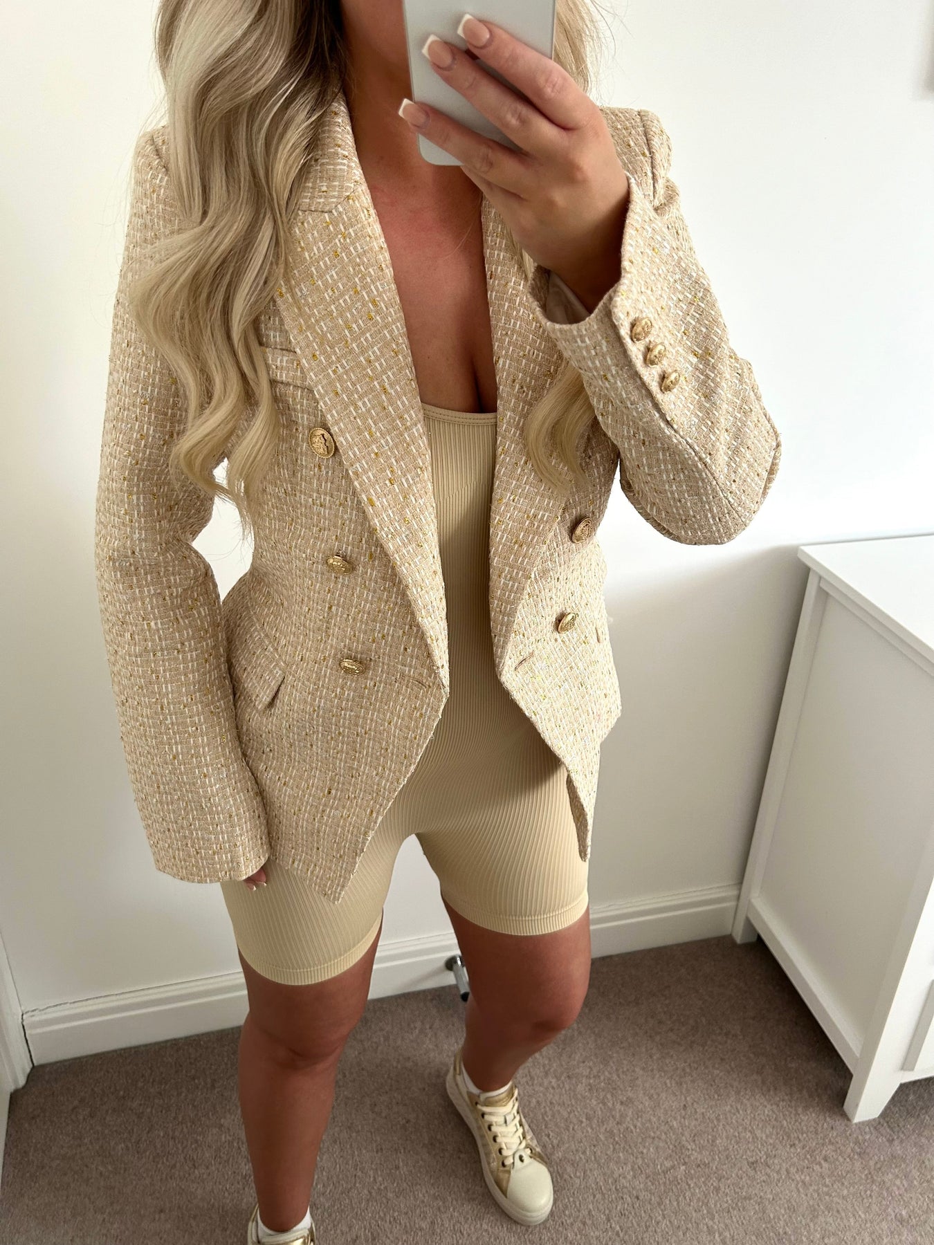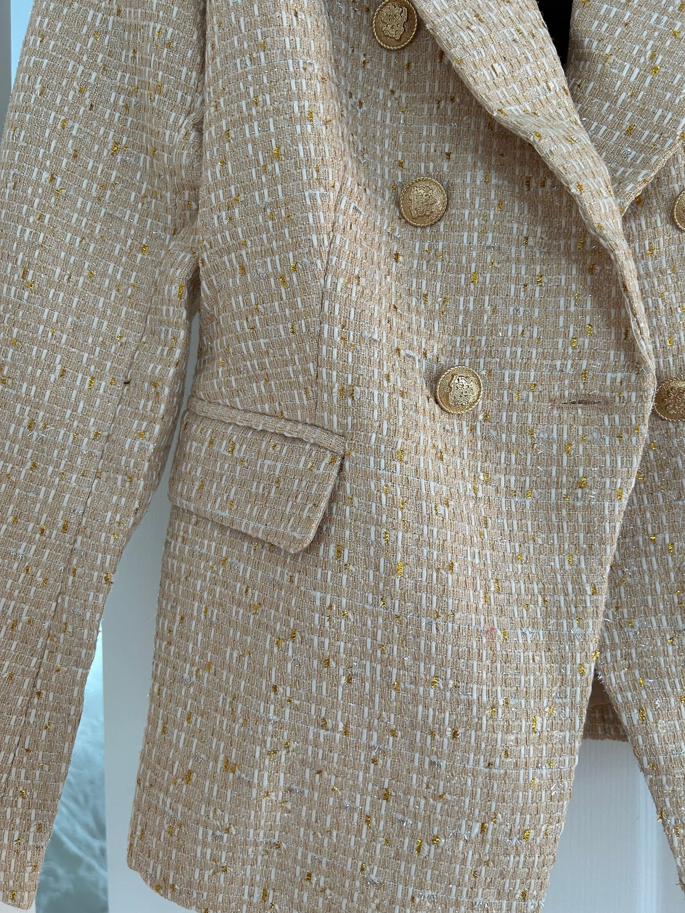 Elevate your style with the Vivienne Modern Blazer, crafted from luxurious beige metallic thread tweed. This versatile piece features double-breasted golden buttons, long sleeves with buttoned cuffs, and practical side flap pockets. Perfect for dressing up or down, this blazer is your go-to for any season, ensuring you look chic and sophisticated all year round.