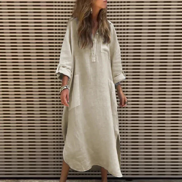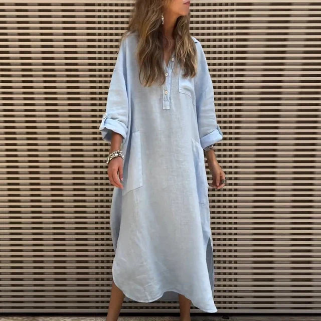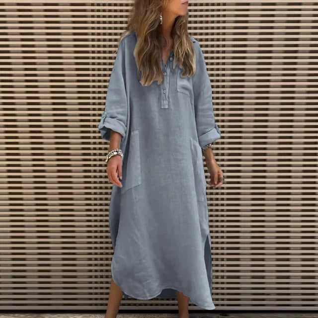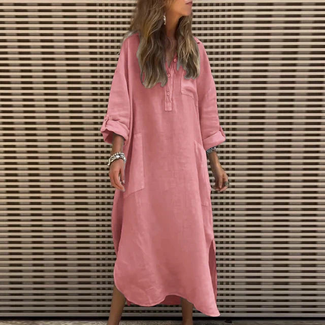Introducing the Kelly™ Casual Cotton Blend Maxi Dress, a perfect blend of comfort and elegance. Crafted from a soft cotton blend, this maxi dress features a buttoned stand collar, long sleeves, and elegant side slits for easy movement. Its loose fit makes it an ideal choice for relaxed outings, casual gatherings, or a cozy day at home during spring and autumn.