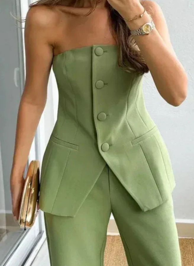 The strapless tailored top hugs your silhouette beautifully, while the sleek, high-waisted pants offer a polished yet comfortable fit. Crafted with precision, the Olivia™ set combines the perfect blend of luxury and practicality, giving you an outfit that transitions seamlessly from day to night.